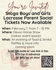 Join your fellow lax moms and dads (and other supporters!) on February 7 from 7 – 10 PM at the Devon Horse Show (indoor event space) for the Stoga Boys and Girls Lacrosse Parent Social.
